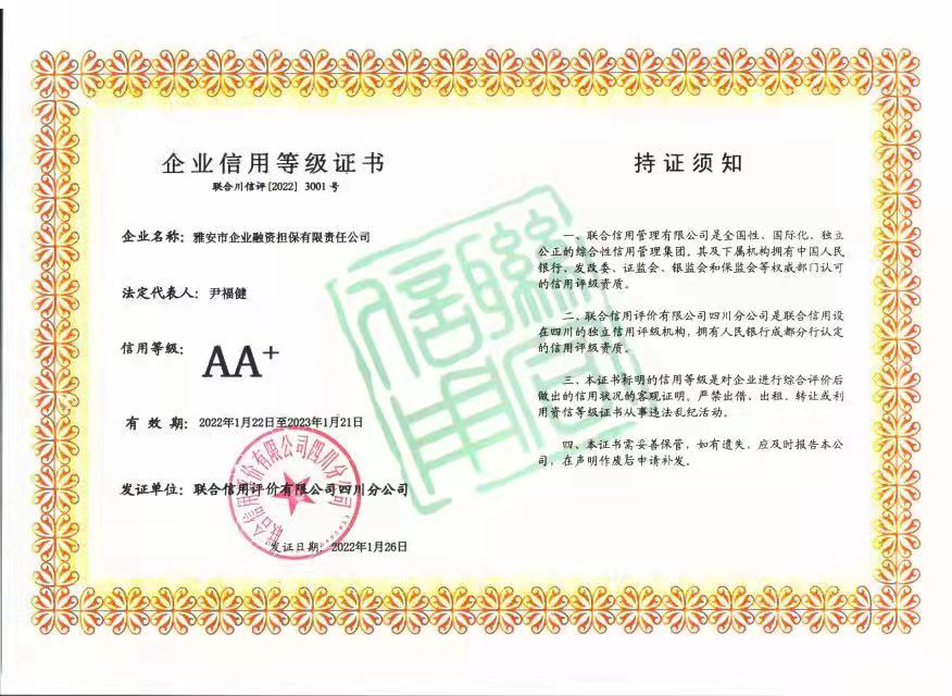 聯(lián)合信用評(píng)價(jià)有限公司是我國信用行業(yè)資質(zhì)最全、服務(wù)區(qū)域最廣,覆蓋規(guī)模最大的信用信息服務(wù)機(jī)構(gòu)之一。近期,該公司先后為四川省信用再擔(dān)保有限公司、成都市現(xiàn)代農(nóng)業(yè)融資擔(dān)保有限公司、瀘州市興瀘融資擔(dān)保集團(tuán)有限公司、眉山市眉州融資擔(dān)保有限公司等20余家川內(nèi)擔(dān)保機(jī)構(gòu)開展2022年度評(píng)級(jí)工作,共評(píng)出了兩家AA+擔(dān)保機(jī)構(gòu),其中就有雅安市擔(dān)保公司。