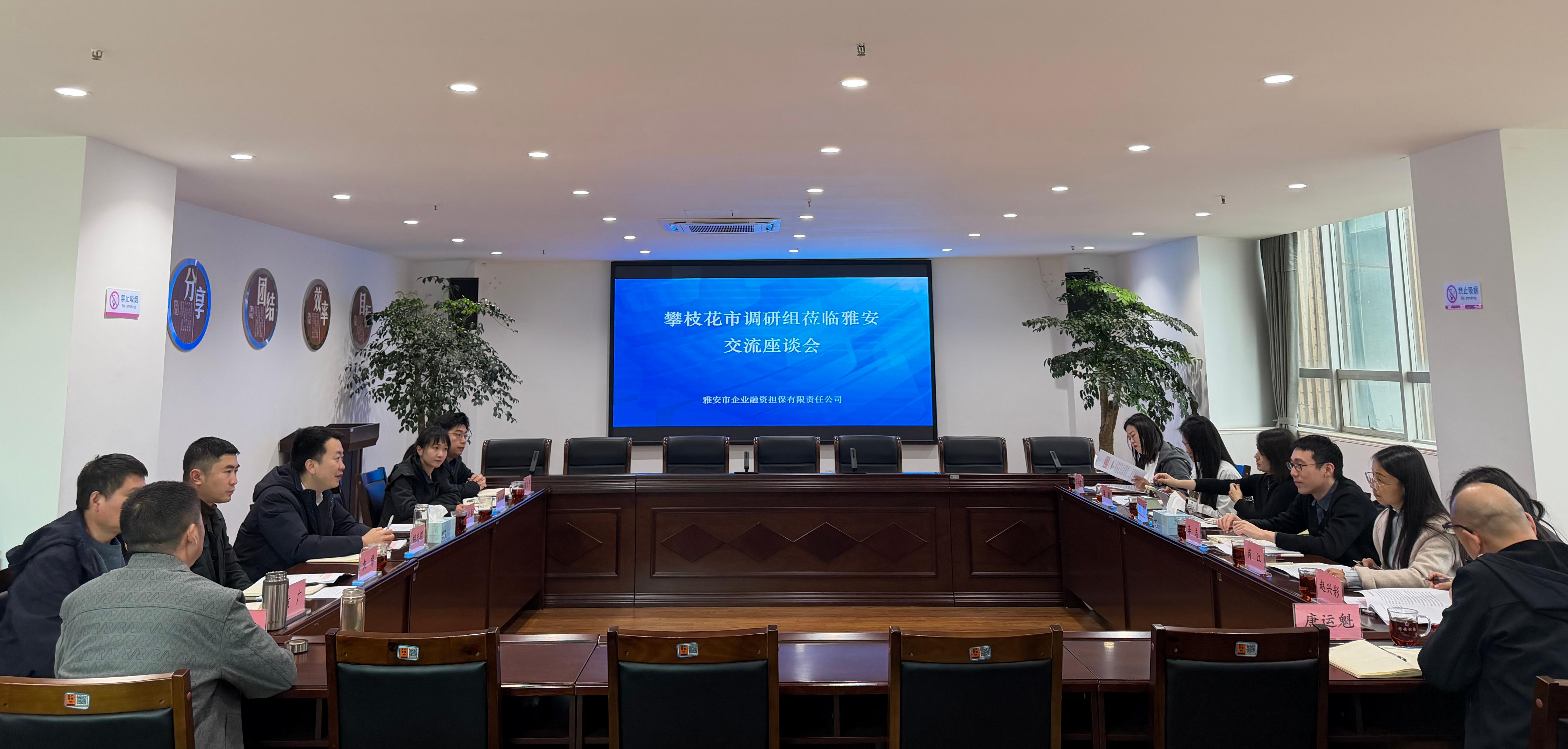 3月16日,攀枝花市財政局副局長李志帶隊,攀枝花發(fā)展(控股)集團(tuán)、攀枝花市創(chuàng)業(yè)貸款融擔(dān)公司一行來到雅安,就政府性融資擔(dān)保公司內(nèi)部治理與制度建設(shè)、業(yè)務(wù)開展、體系建設(shè)及風(fēng)險控制等方面開展調(diào)研。雅安市財政局金融資本科科長劉冉婷參加座談會。